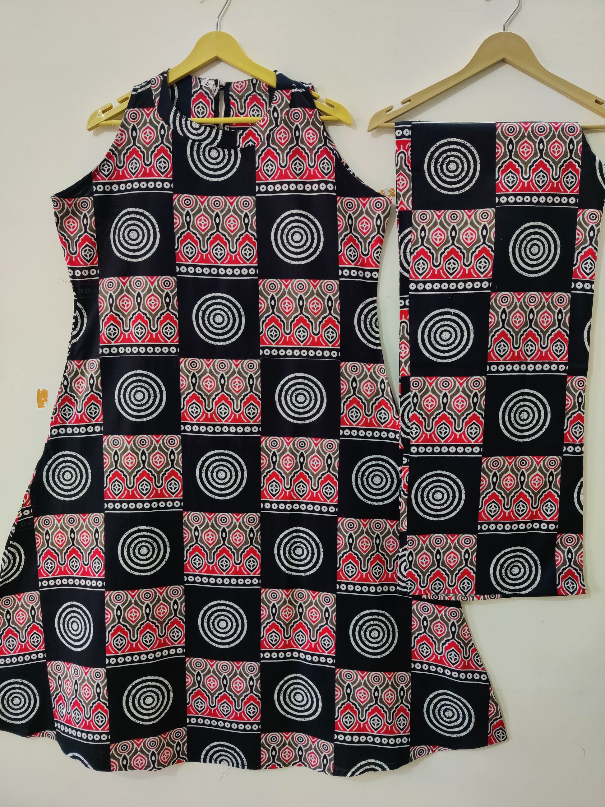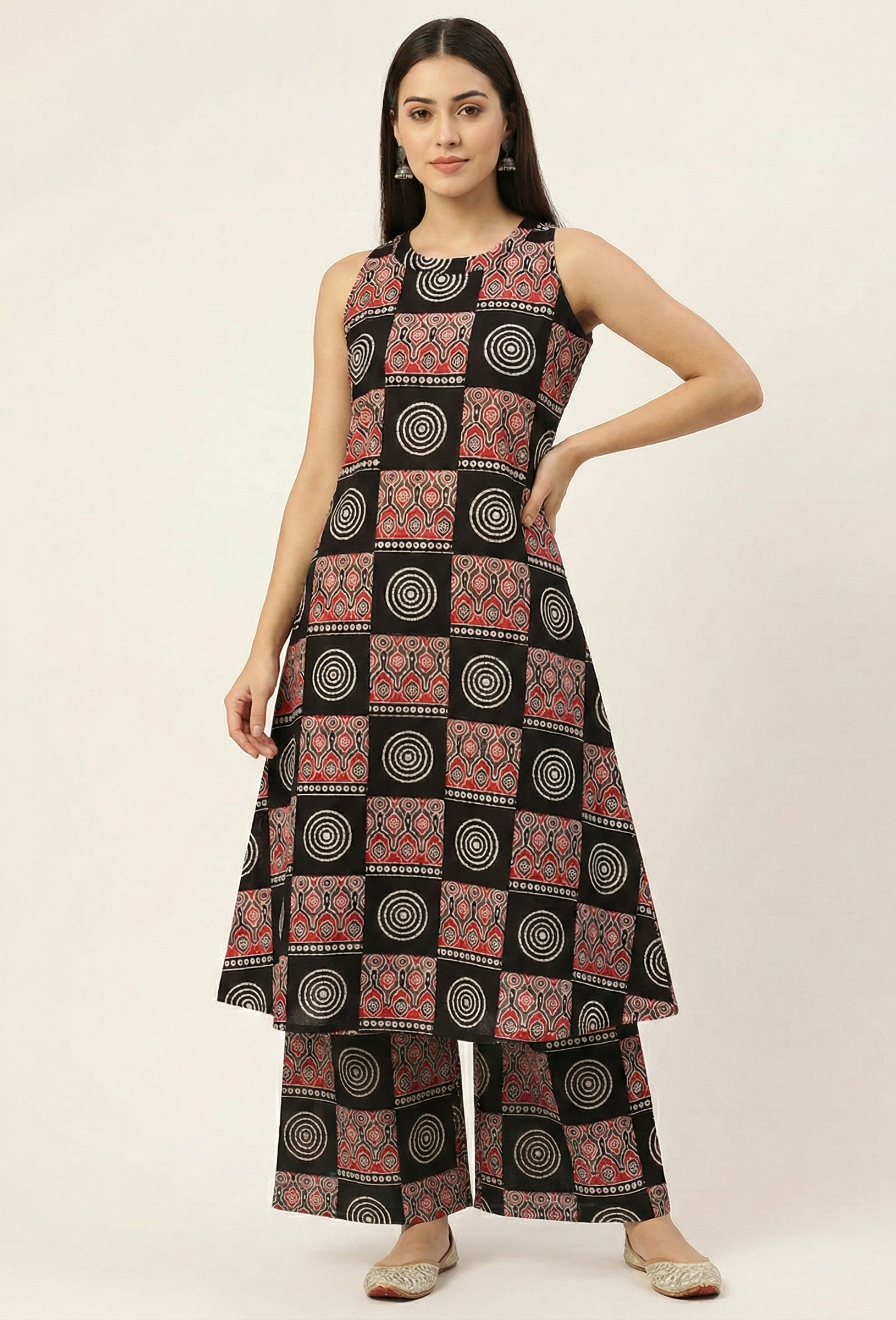 This set features a sleeveless, A-line kurta adorned with a captivating geometric block print in contrasting tones of deep red and beige against a black canvas. It is paired with matching wide-leg palazzo pants that offer breezy comfort and a contemporary silhouette. Crafted from soft, breathable fabric (likely cotton), this ensemble is perfect for casual outings, work-from-home days, or light festive gatherings.