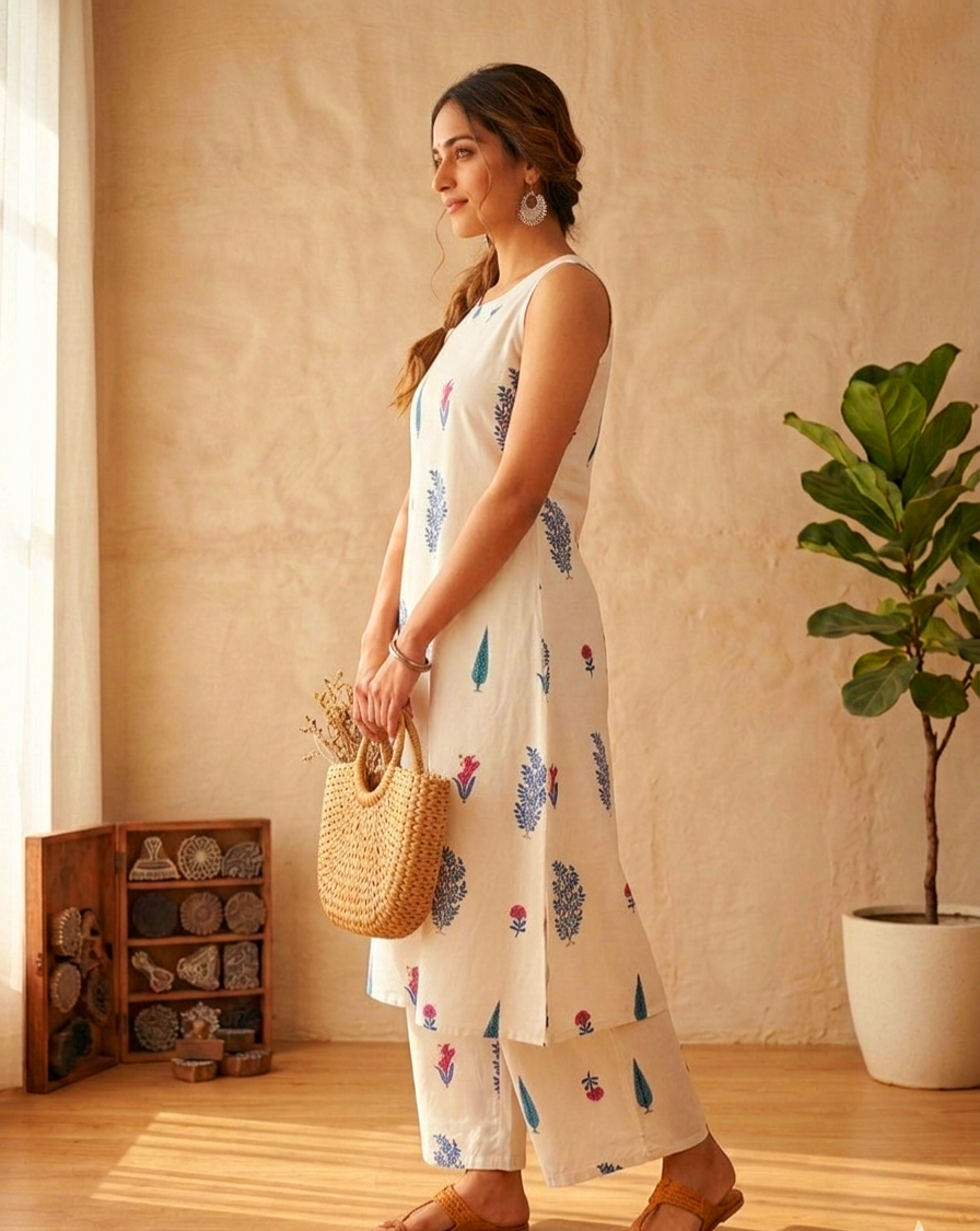 Keep your summer style fresh and breezy with this stunning White Floral Kurta Set from Three Butterfly. Designed to beat the heat while keeping you effortlessly chic, this outfit features a comfortable sleeveless A-line kurta. The crisp white fabric serves as a perfect canvas for the vibrant blue and pink botanical block prints, giving it a soothing, earthy vibe.